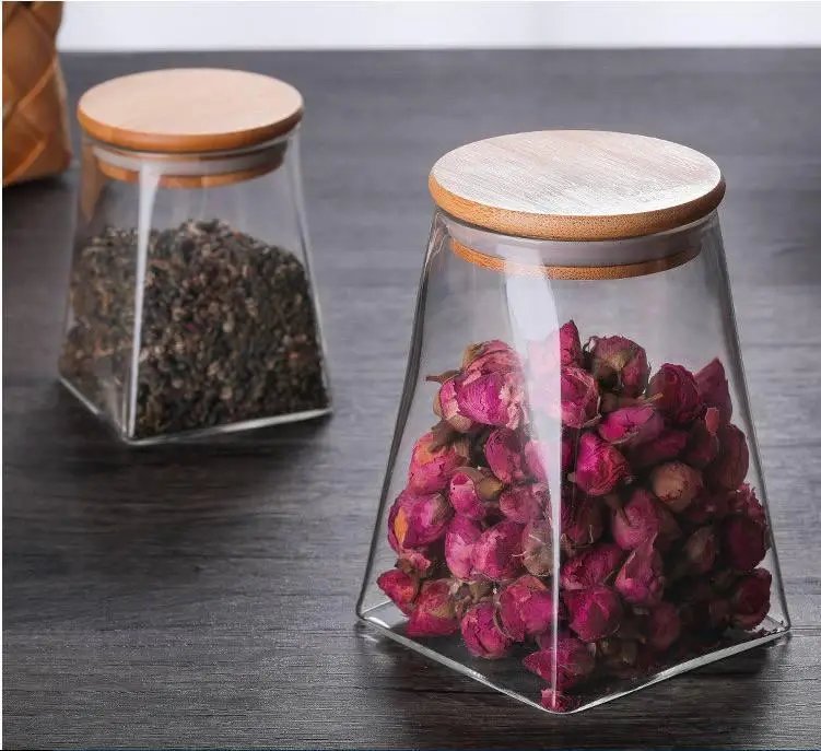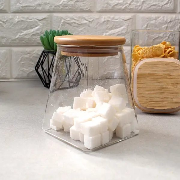 Прозора банка для зберігання з боросилікатного скла має конусну форму й об’єм 510 мл. Оснащена щільною бамбуковою кришкою. Висота – 12 см. Можна мити в посудомийній машині.