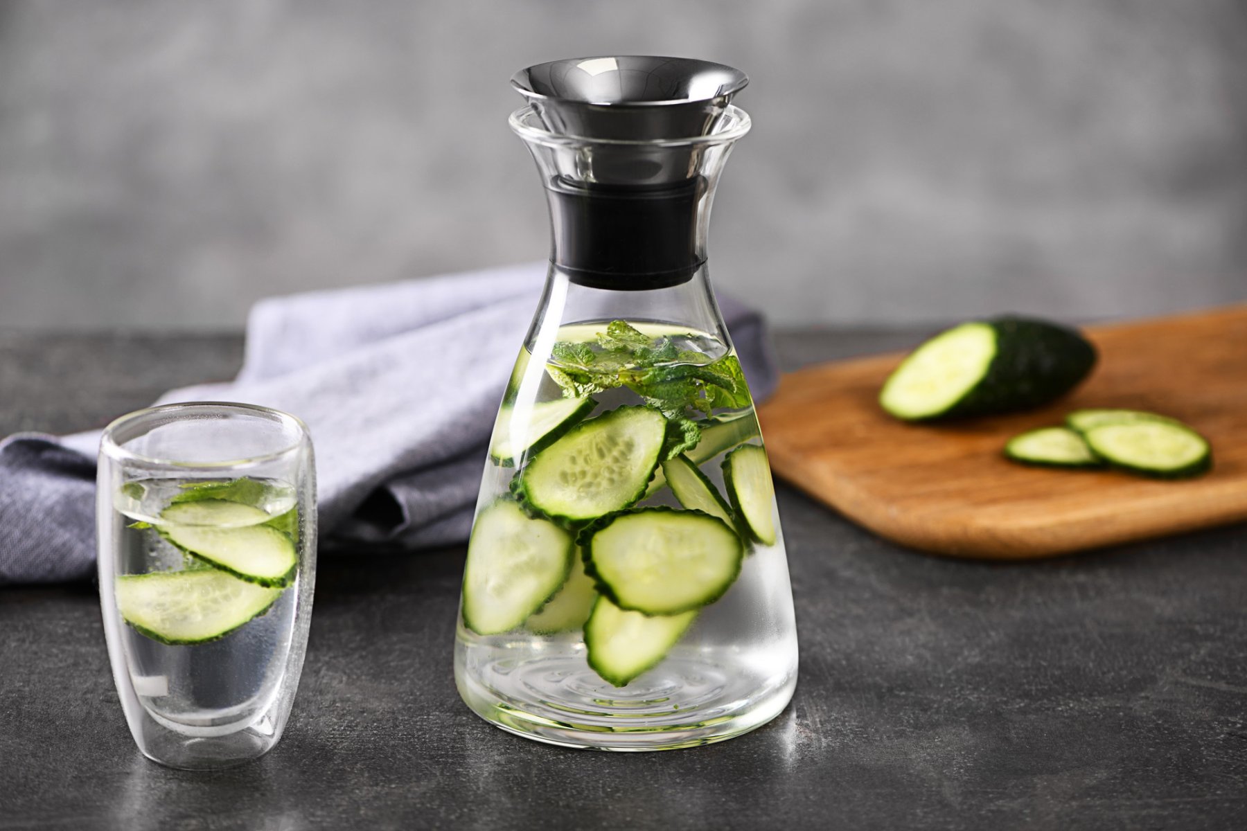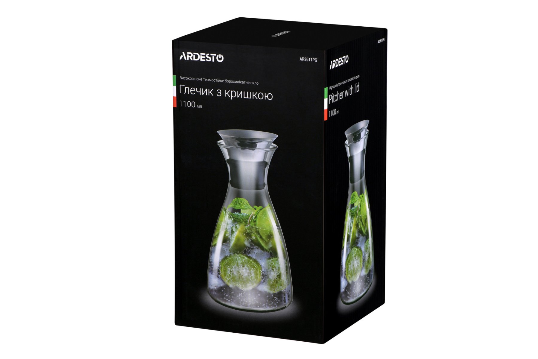 Глечик з кришкою об’ємом 1100 мл для гарячих та холодних напоїв. Виготовлений з термостійкого боросилікатного скла, а кришка з нержавіючої сталі, доповнена силіконовим ущільнювачем.