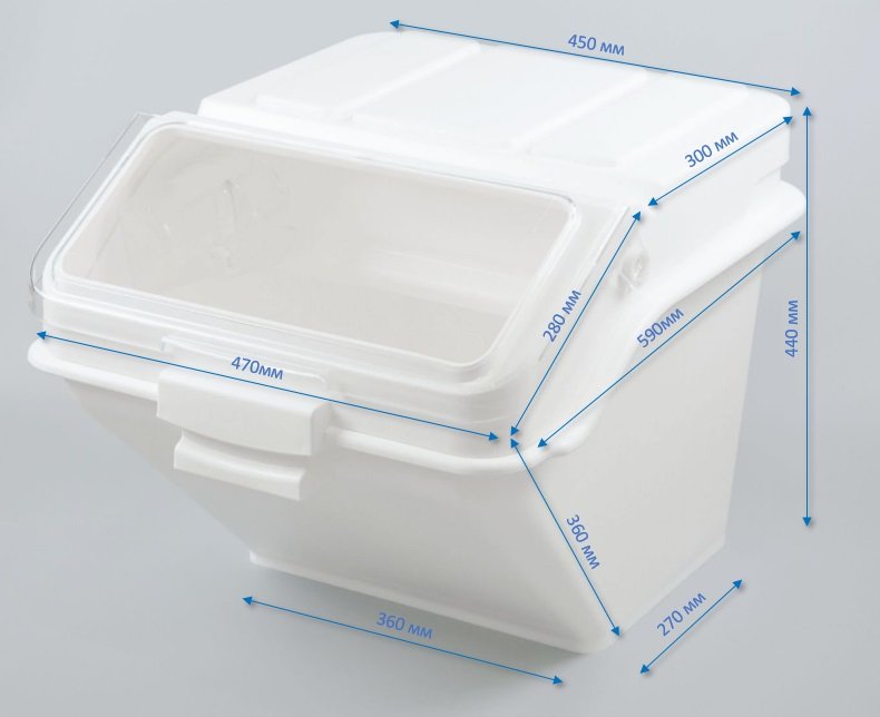 Виготовлений з поліпропілену (прозора кришка з полікарбонату). Призначений для зберігання та розтарювання різних сипких продуктів. Конструкція контейнерів дозволяє розміщувати вертикально один на одному. Прозора кришка в комплекті дозволяє бачити, який продукт знаходиться в контейнері та його заповненість.