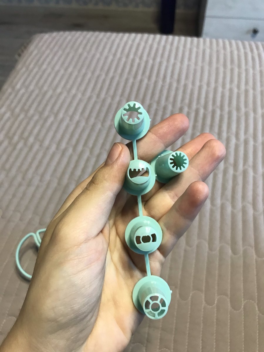 Кондитерський шприц з шістьма насадками різної форми, за допомогою яких можна формувати різноманітні візерунки.