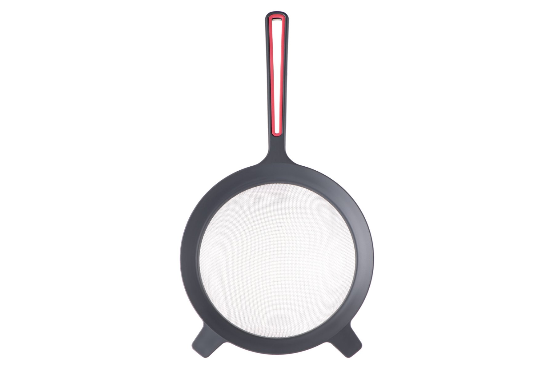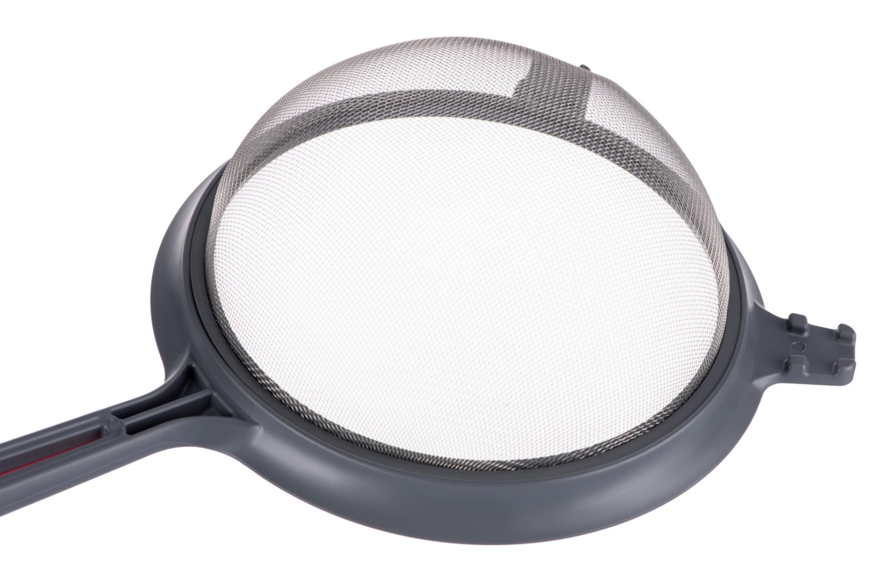Зручне стильне сито з пластику та нержавіючої сталі завдовжки діаметром 17 см. Оснащено ергономічним пластиковим руків’ям сірого кольору з червоною вставкою, що є приємним на дотик. Стане надійним помічником під час готування страв. Можна мити в посудомийній машині.