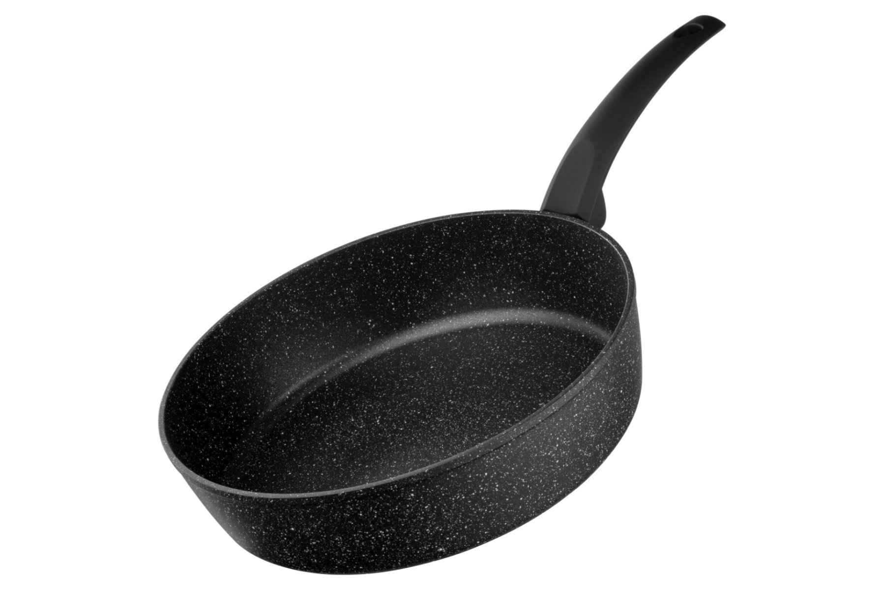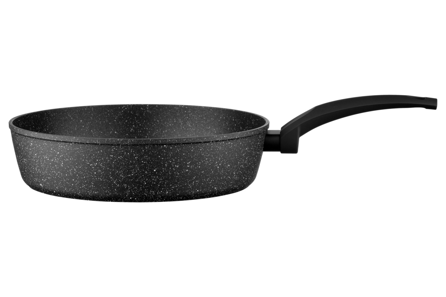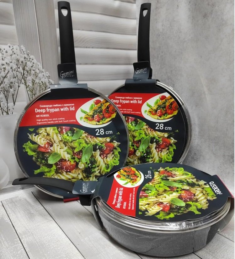 Сковороду виготовлено з кованого алюмінію, її діаметр – 28 см. За висоти 7 см товщина стінок становить 2,6/4 мм, а дна – 2,6 мм. Внутрішня поверхня має тришарове протипригарне покриття PFLUON, а бакелітове руків’я – soft-touch. З огляду на це виріб не рекомендовано мити в посудомийній машині.