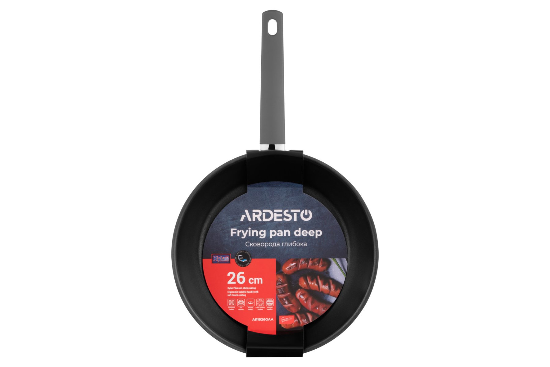 Глибока сковорода ARDESTO Gemini діаметром 26 см виготовлена з алюмінію, зовнішня поверхня сковорідки виготовлена з нержавіючої сталі. Товщина стінок і дна дещо різниться – 0,6 і 3 мм відповідно. Ергономічне бакелітове руків’я має soft-touch-покриття, а внутрішня поверхня виробу – протипригарне (Xylan Plus). З огляду на використані для виробництва матеріали сковороду не рекомендовано мити в посудомийній машині. Універсальність моделі зумовлена широкою сумісністю з різними видами плит: газовими, електричними, склокерамічними, індукційними й галогенними.
