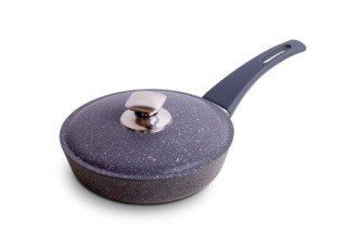 Сковорода глибока з потовщеними стінками і дном, з алюмінієвою кришкою, виготовлена з алюмінієвого сплаву з анесенням протипригарного покриття, колір - темно-сірий граніт. Має круглу форму, діаметр 220 мм, висота стінок 50 мм, товщина стінок 5 мм, товщина дна 5 мм. Вага нетто 1,130 кг. Комплектується ручкою на кришці і бакелітовою ручкою темно-сірого кольору з ефектом Soft- touch на корпусі сковороди.