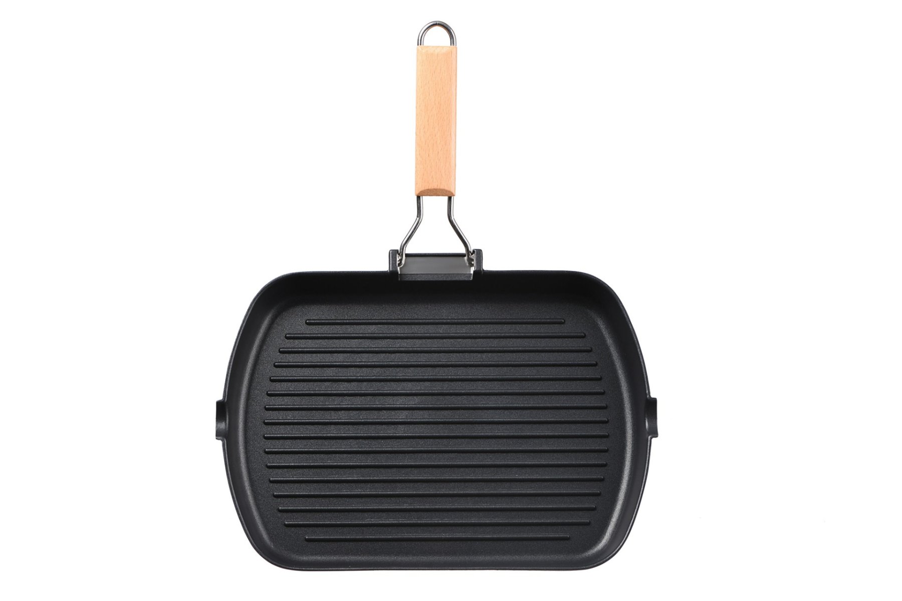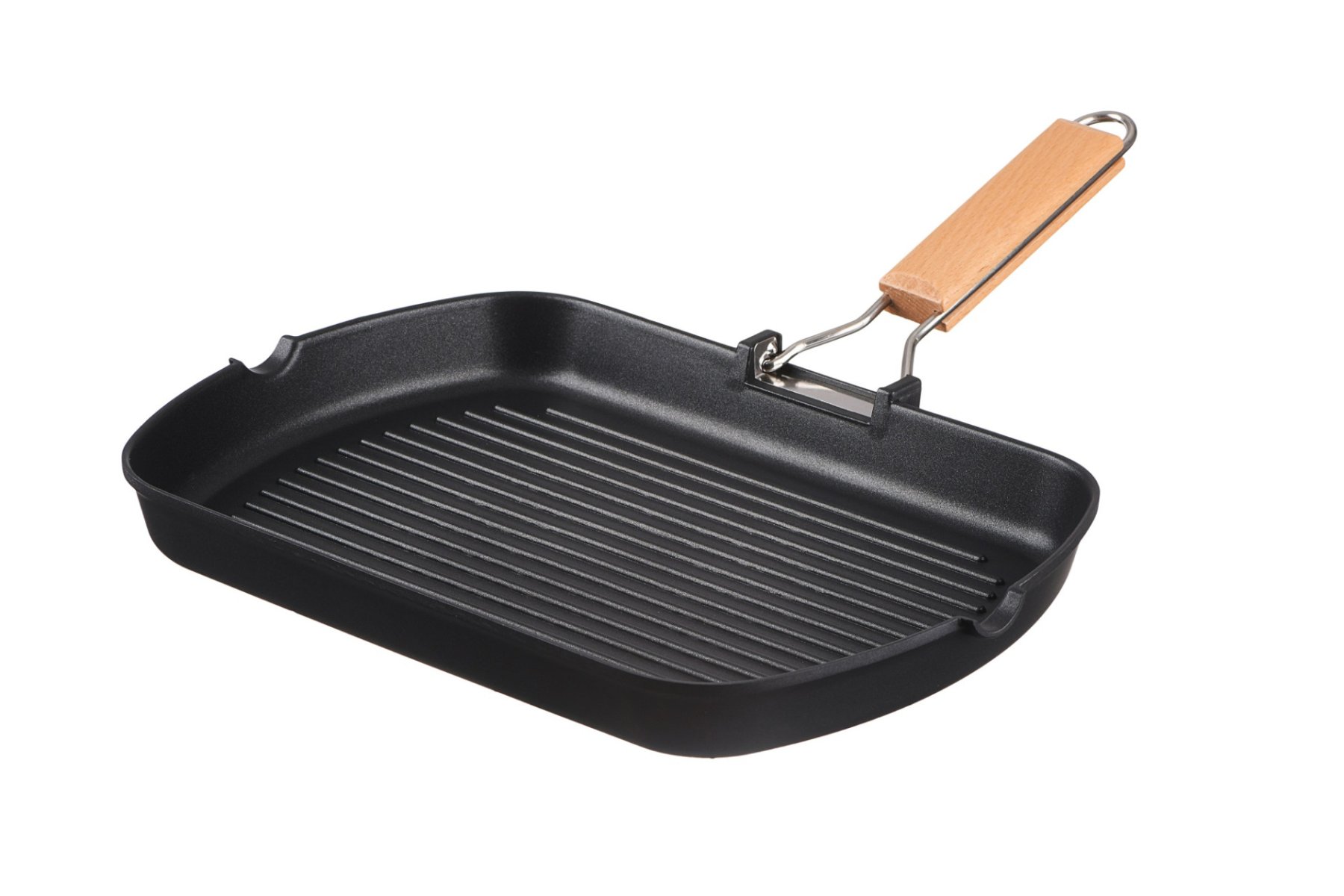 Чорна алюмінієва сковорода-гриль завдяки товстому дну (5 мм) і відповідному рельєфу поверхні дає змогу в домашніх умовах створити ефект приготування їжі на грилі. Дерев’яна ручка не нагрівається та є зручною в користуванні. Розмір сковороди – 34 × 24 см. Висота стінок – 4 см, товщина – 1,5 мм. Сковорода сумісна з газовими, електричними, склокерамічними, індукційними та галогенними плитами. Не рекомендовано мити в посудомийній машині.