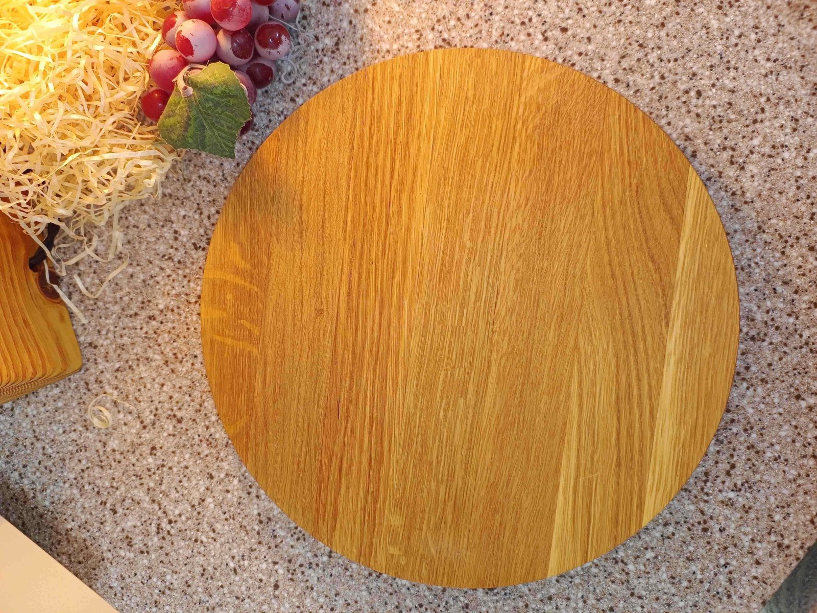 Кругла дерев'яна дошка. Ефектна і стильна дошка, призначена під піцу або інші страви, є необхідним аксесуаром сучасного кафе, бару, ресторану, піцерії. Діаметр виробу — 35см, завдяки чому можна подавати на ньому великі піци або торти. Модна тенденція подавати на дерев’яних підносах м’ясні та інші страви. З лицьового боку виготовляється декоративна кандака, її функція збирає весь жир, який буде стікати на край поверхні.
