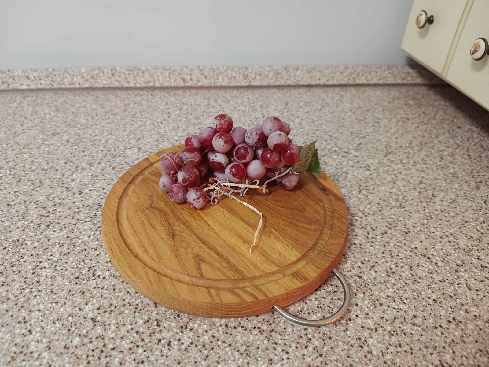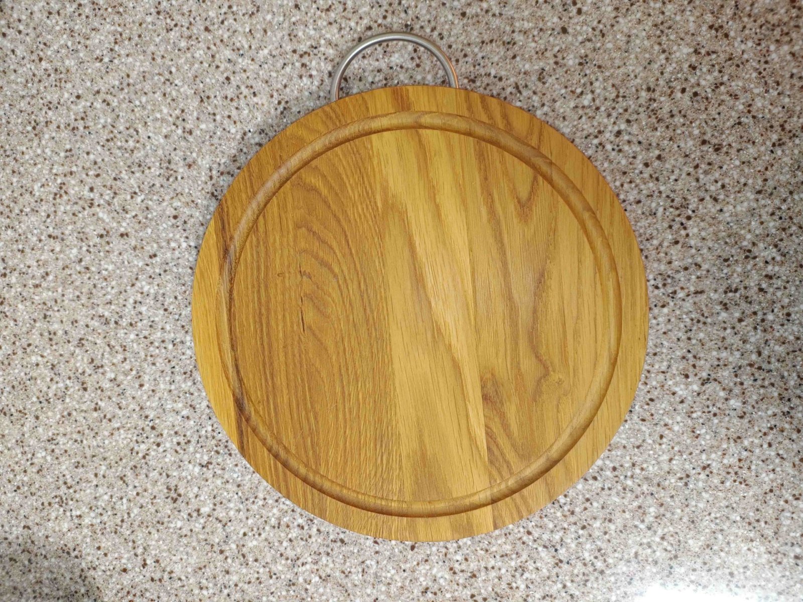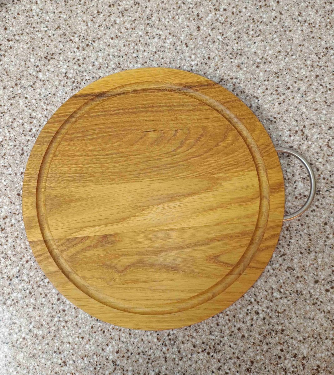 Кругла дерев'яна дошка. Виготовлена з ясена. Ефектна і стильна дошка, призначена під піцу або інші страви, є необхідним аксесуаром сучасного кафе, бару, ресторану, піцерії. Діаметр виробу — 25 см, завдяки чому можна подавати на ньому великі піци або торти. Модна тенденція подавати на дерев’яних підносах м’ясні та інші страви. З лицьового боку виготовляється декоративна кандака, її функція збирає весь жир, який буде стікати на край поверхні.